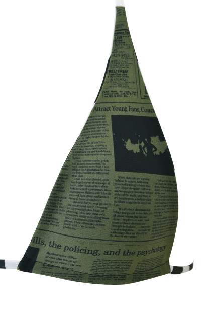 - Black and white stripe print on one side, with an olive green newspaper print on the reverse side