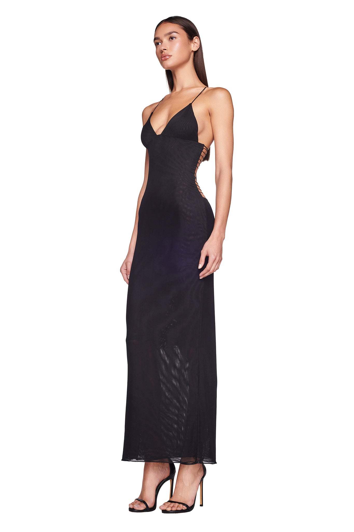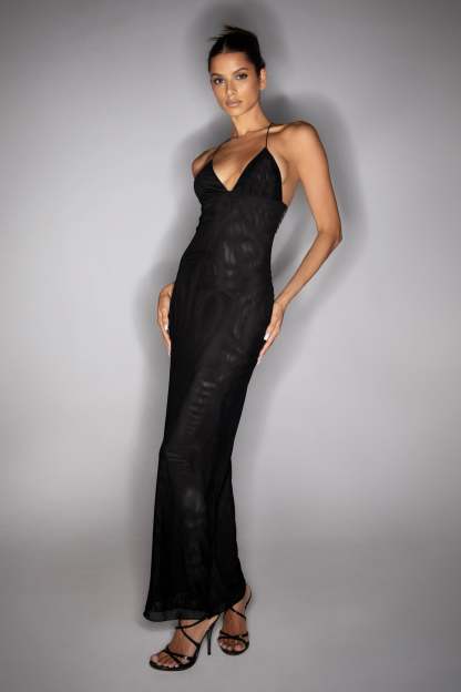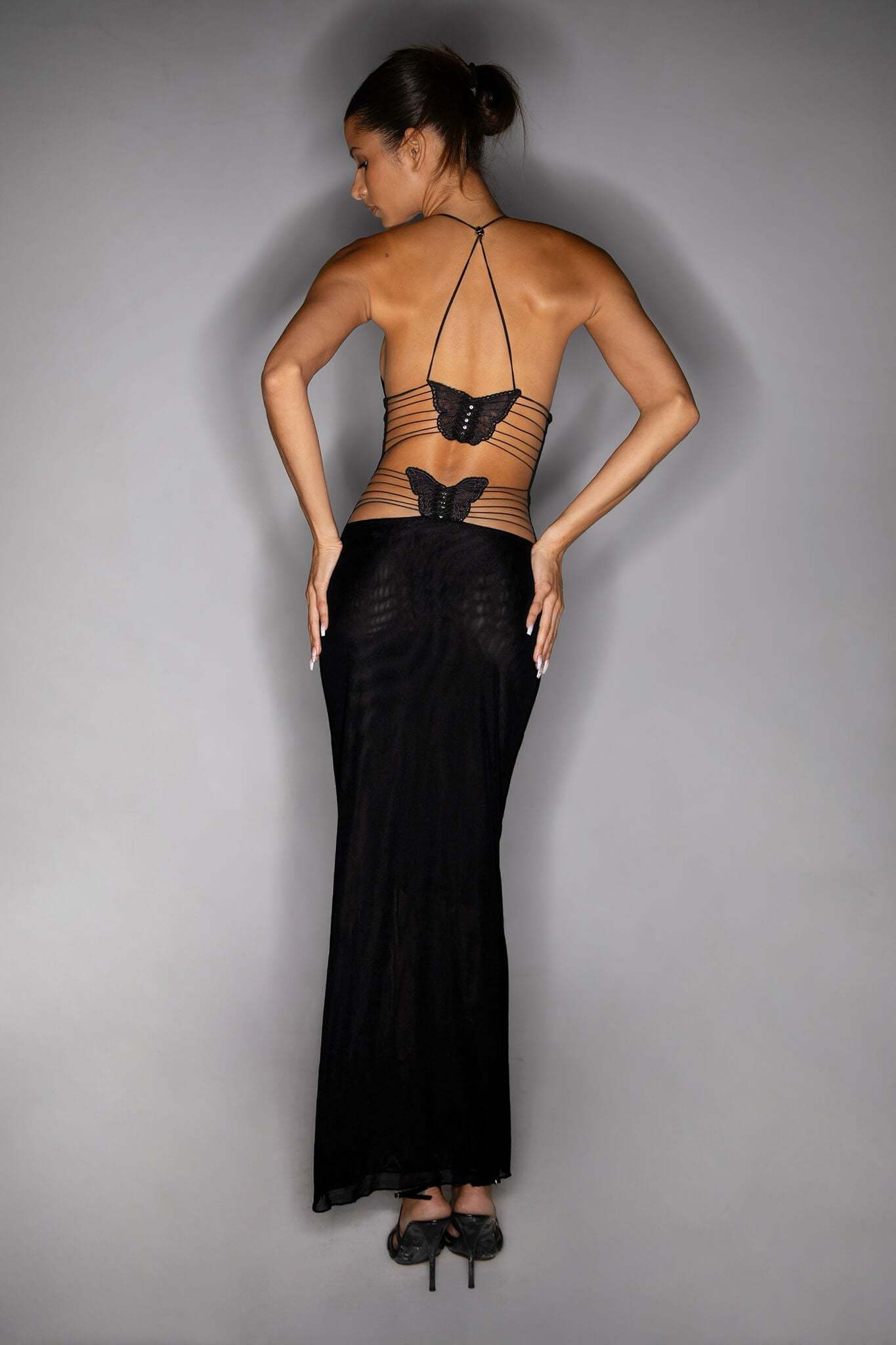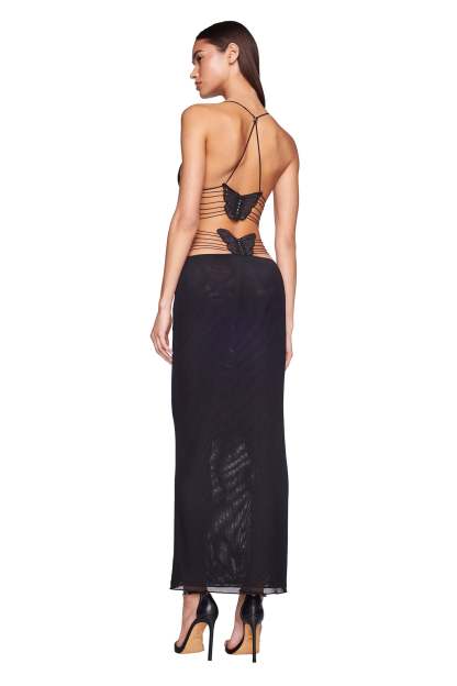 - Black mesh maxi dress with butterfly detail