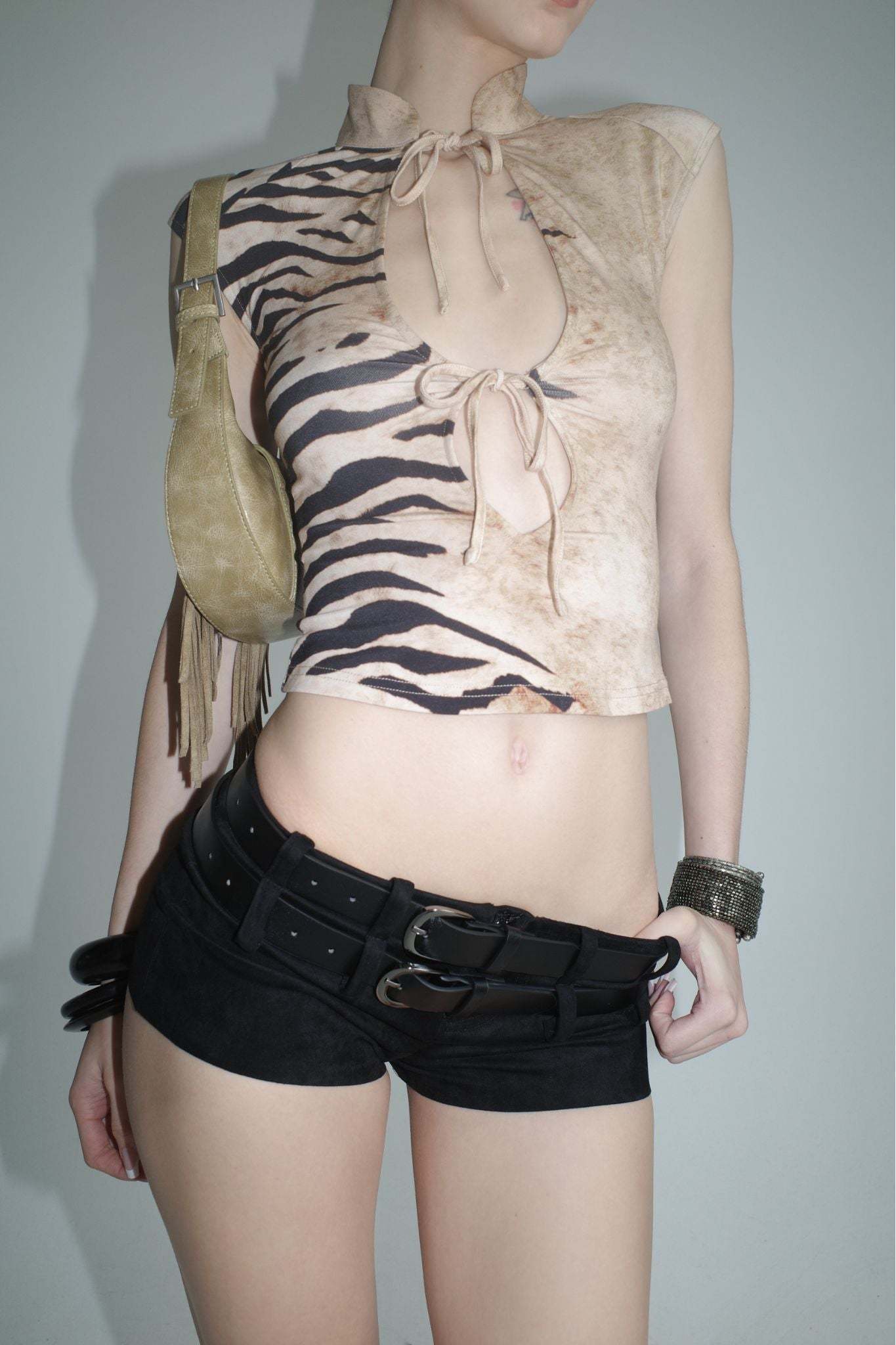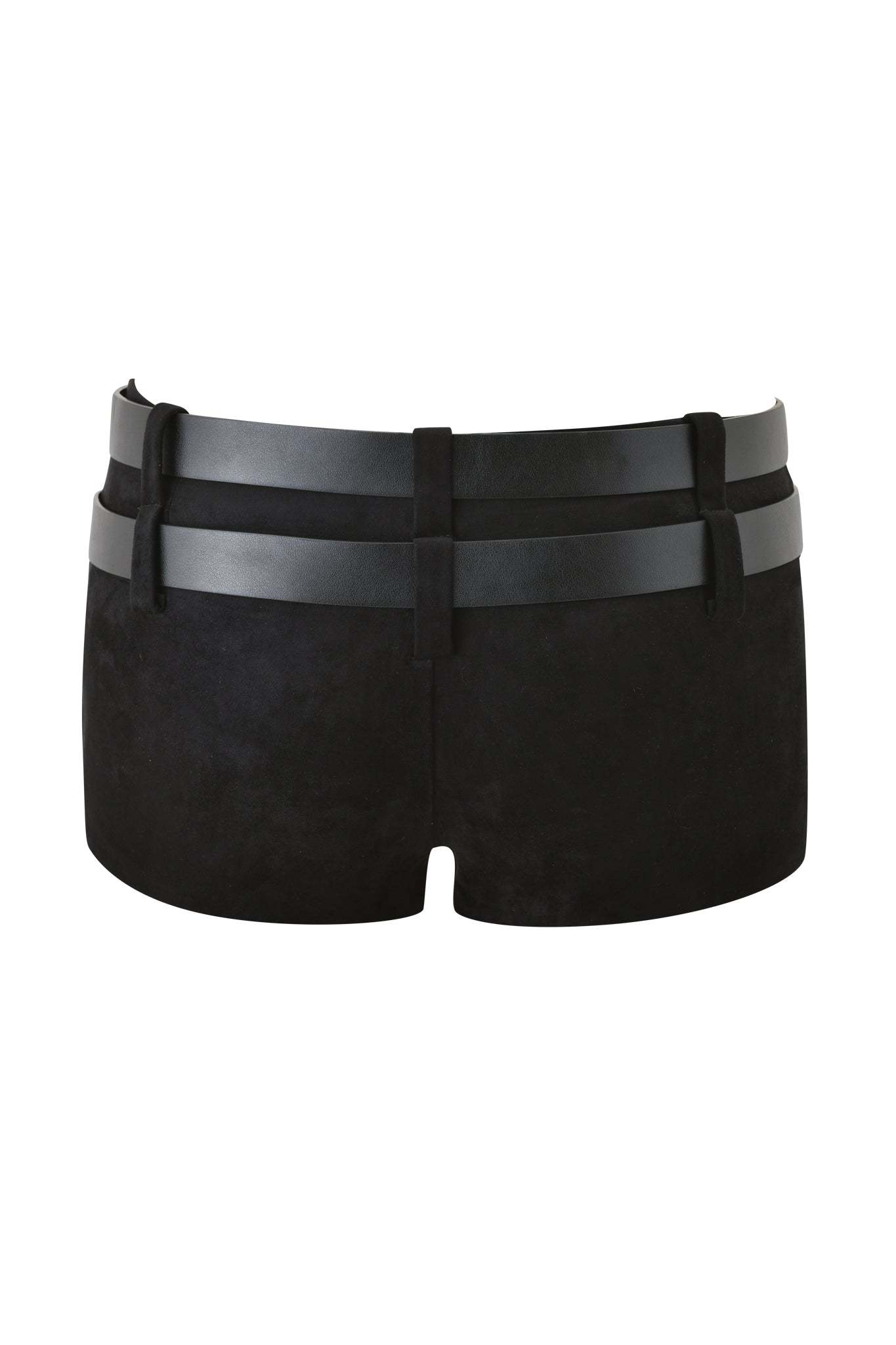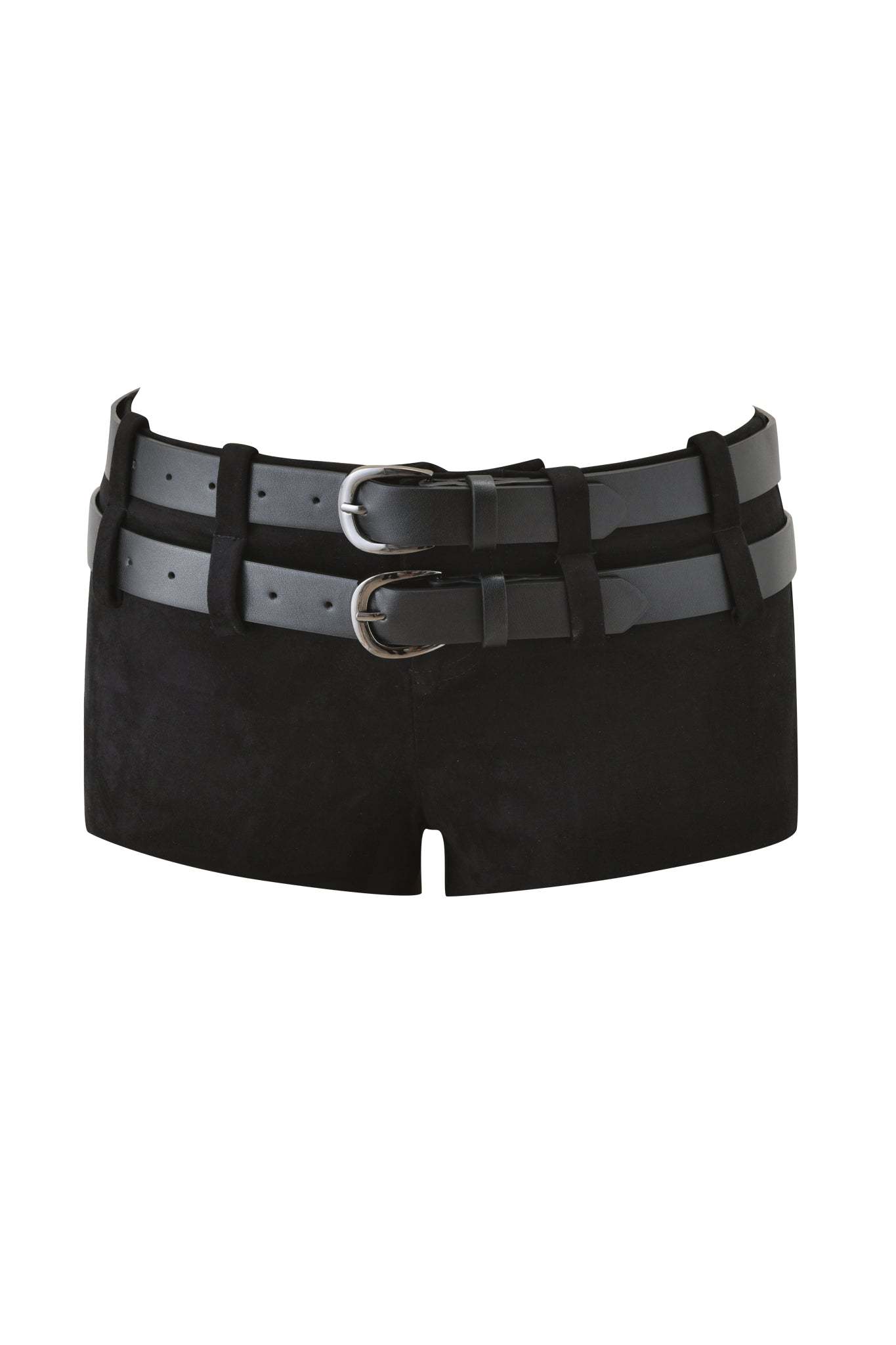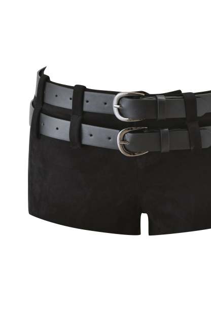 - Includes two detachable patent vegan leather belts with silver toned buckles