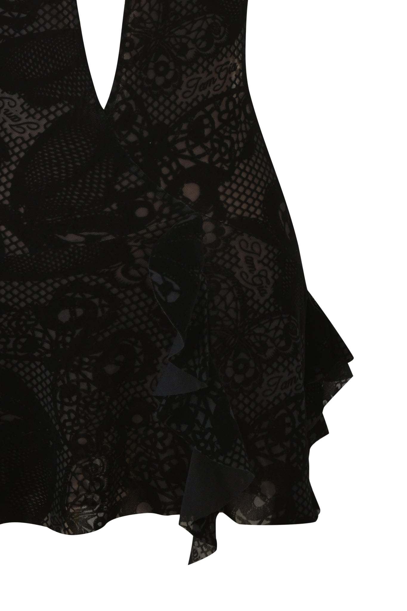 - Asymmetrical tiered ruffle hem with cascading ruffles at front and side seam