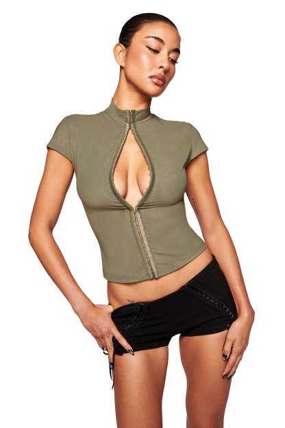- Silver hook and eye closure down centre front that can be fully or partially closed for a keyhole effect