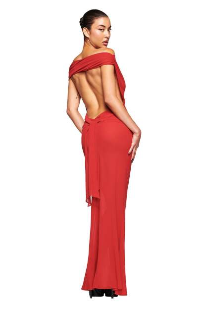 - Red off the shoulder maxi dress
