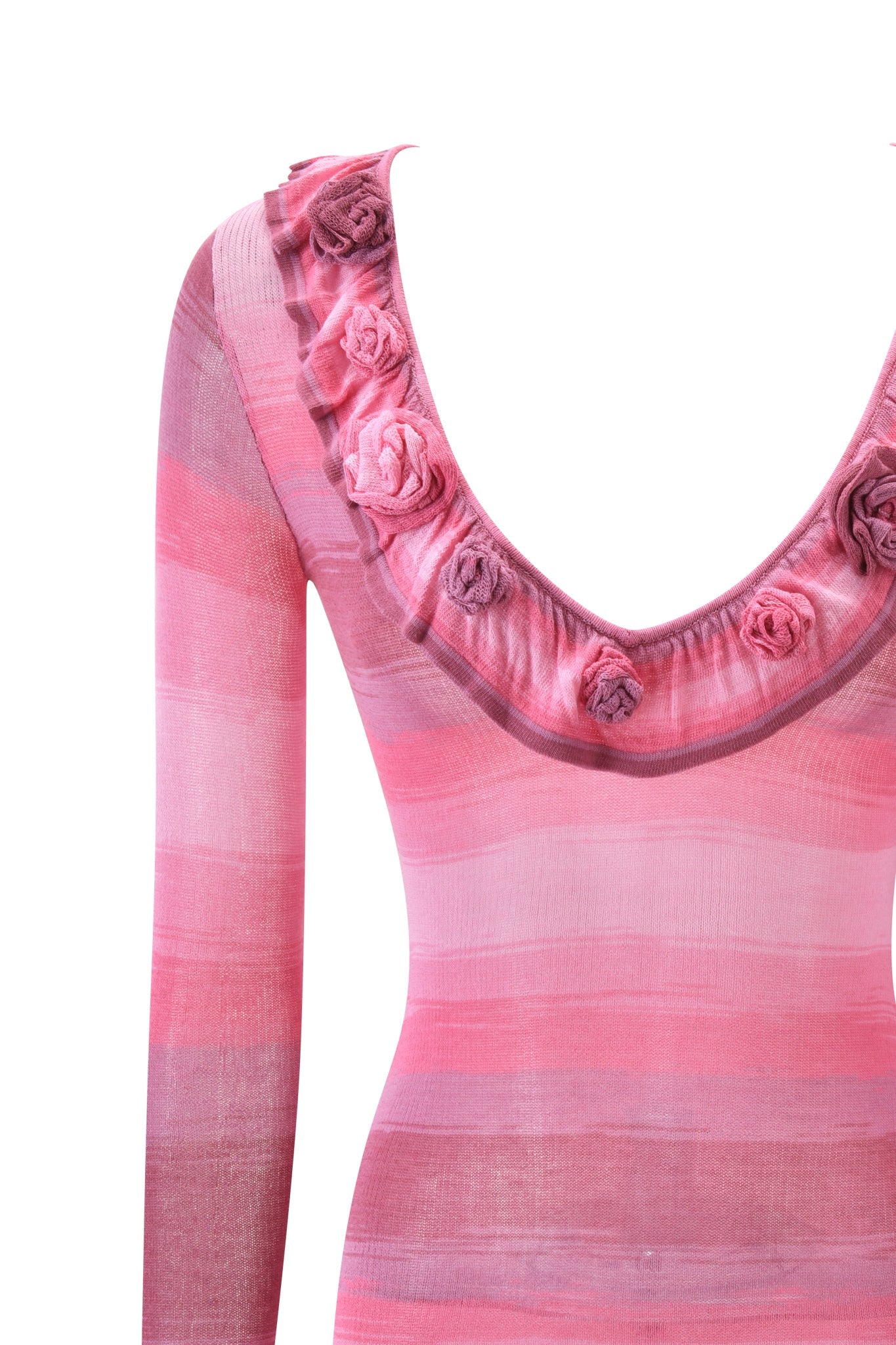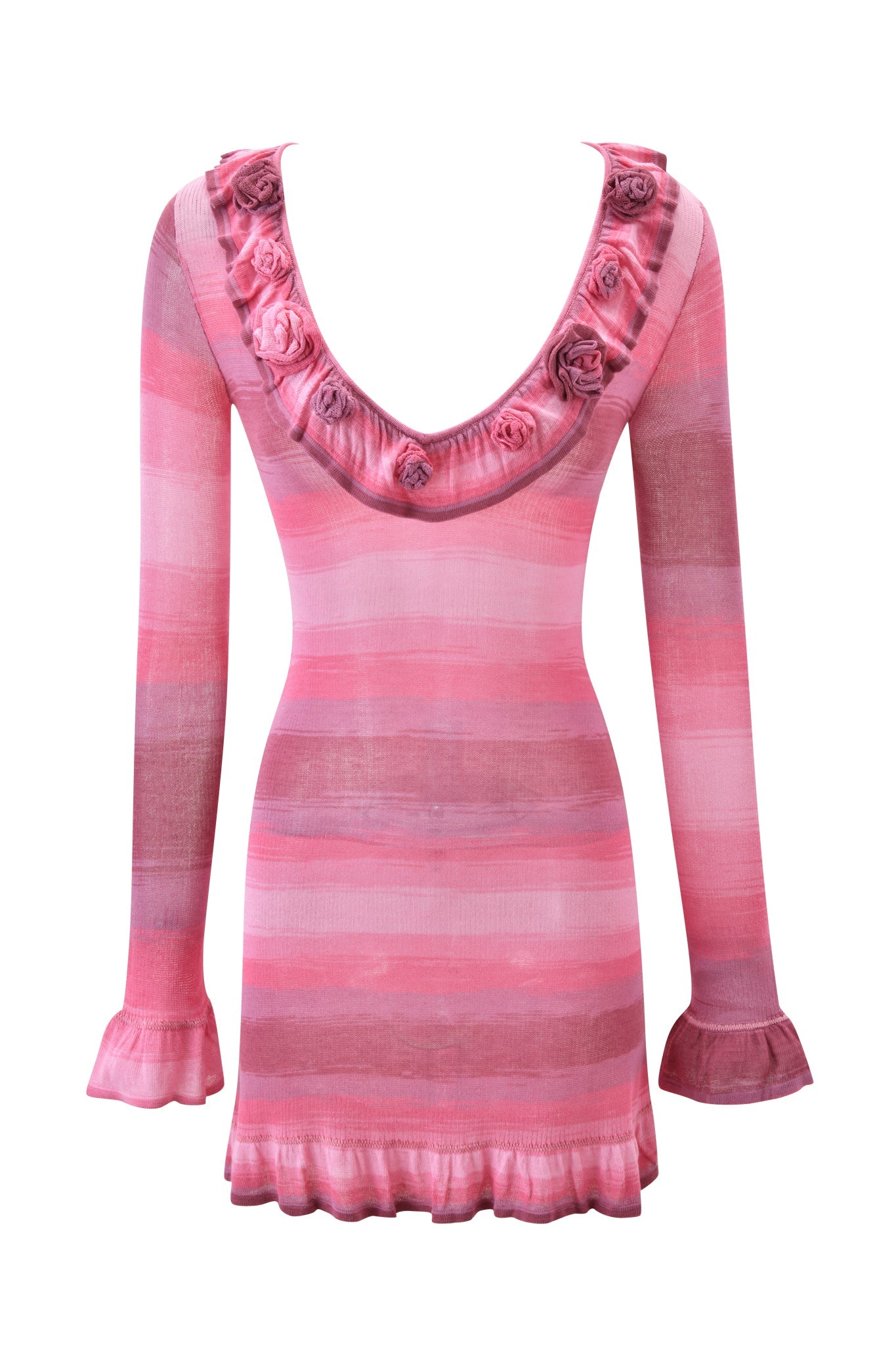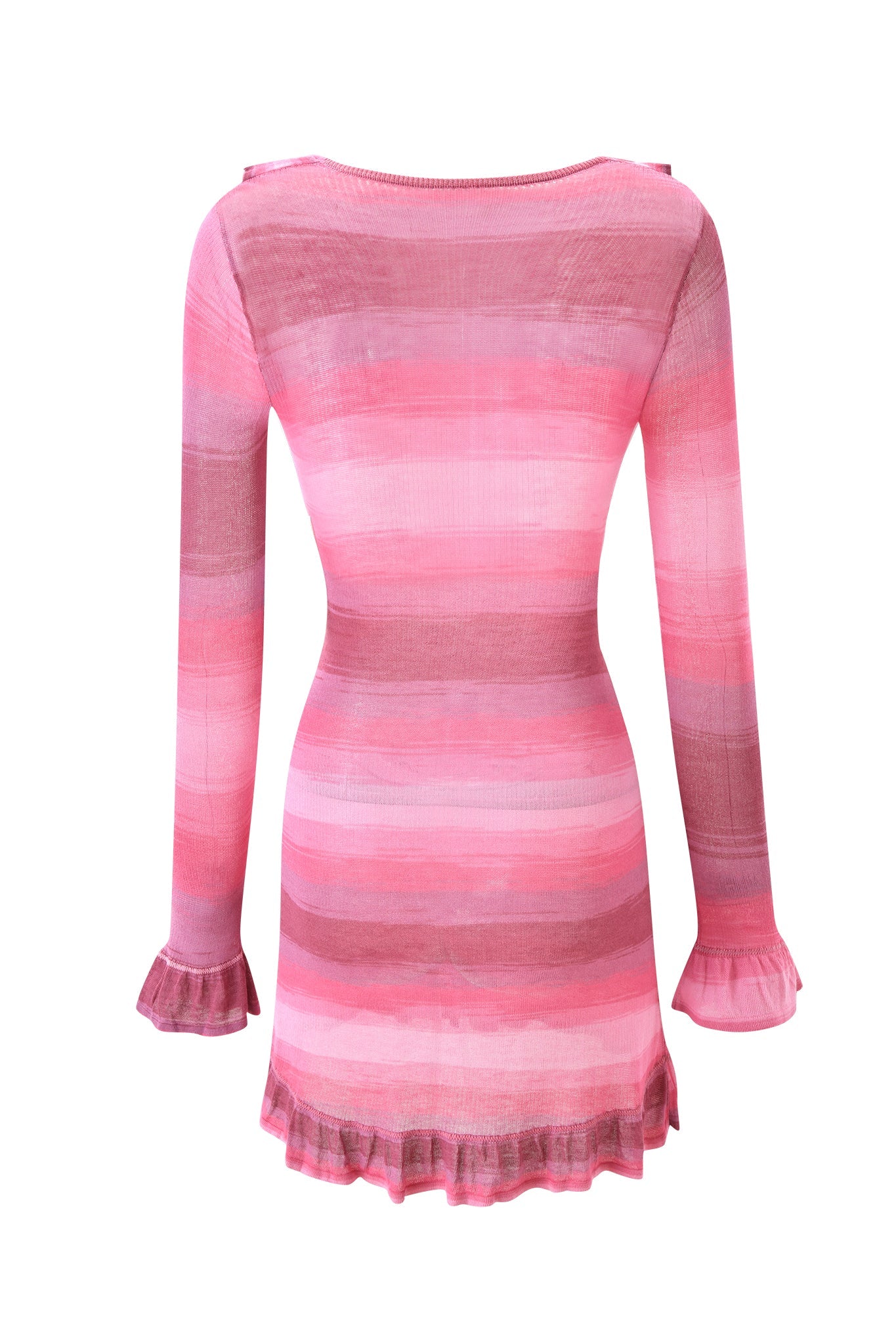- Long sleeve v-neck mini dress in pink ombre knitted fabric