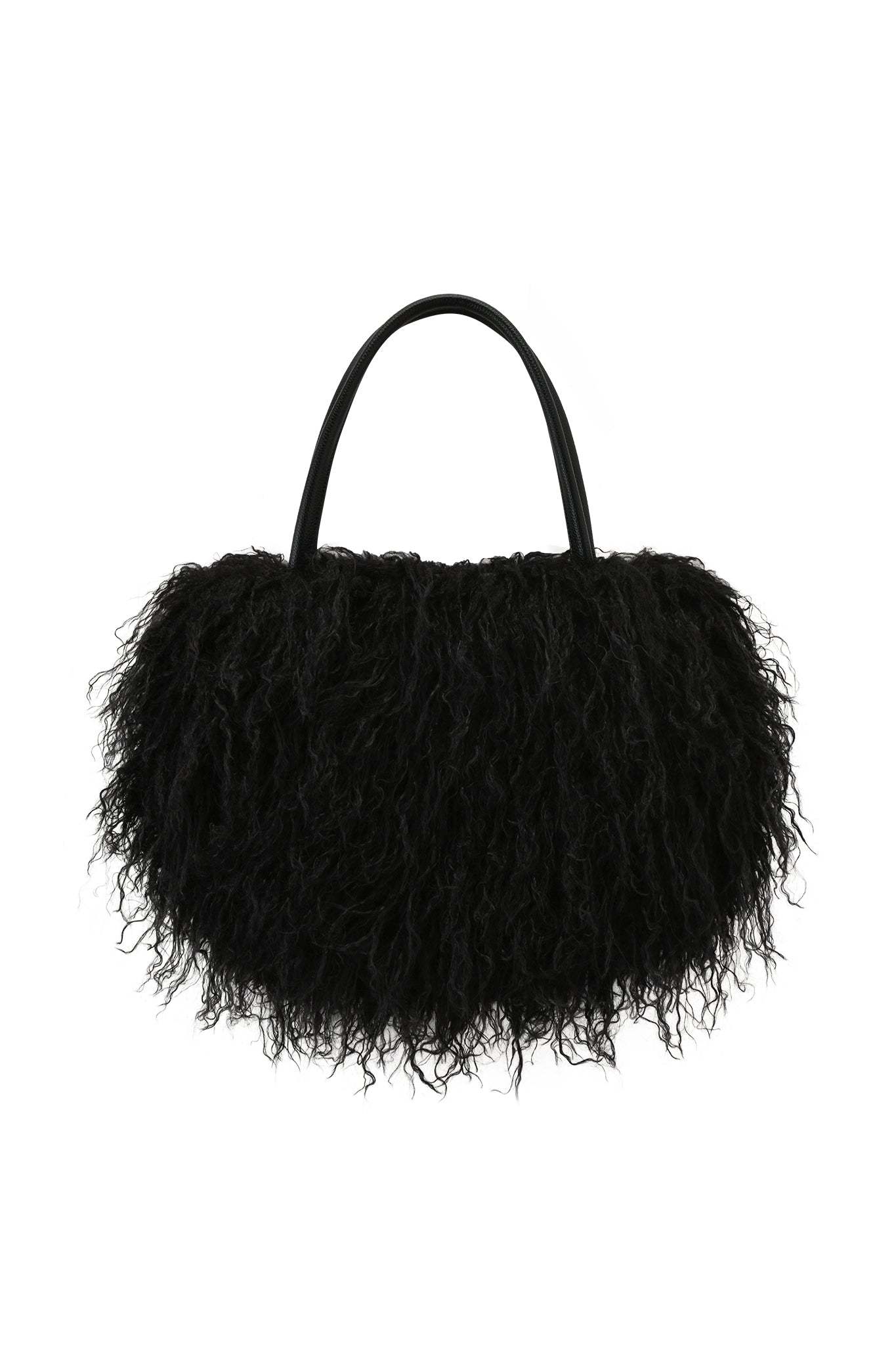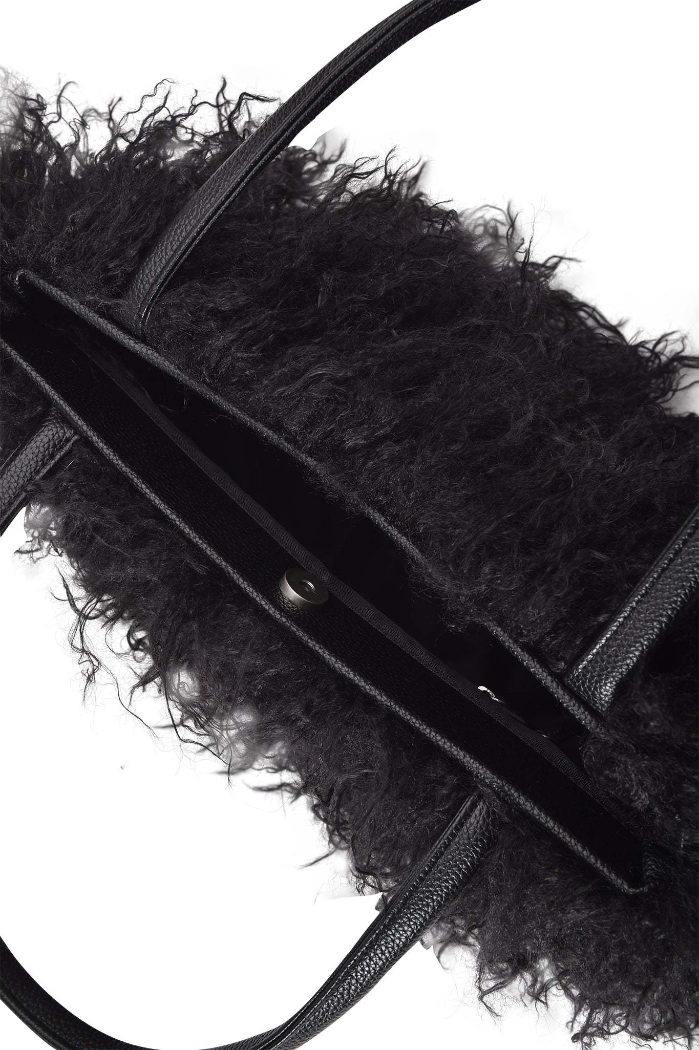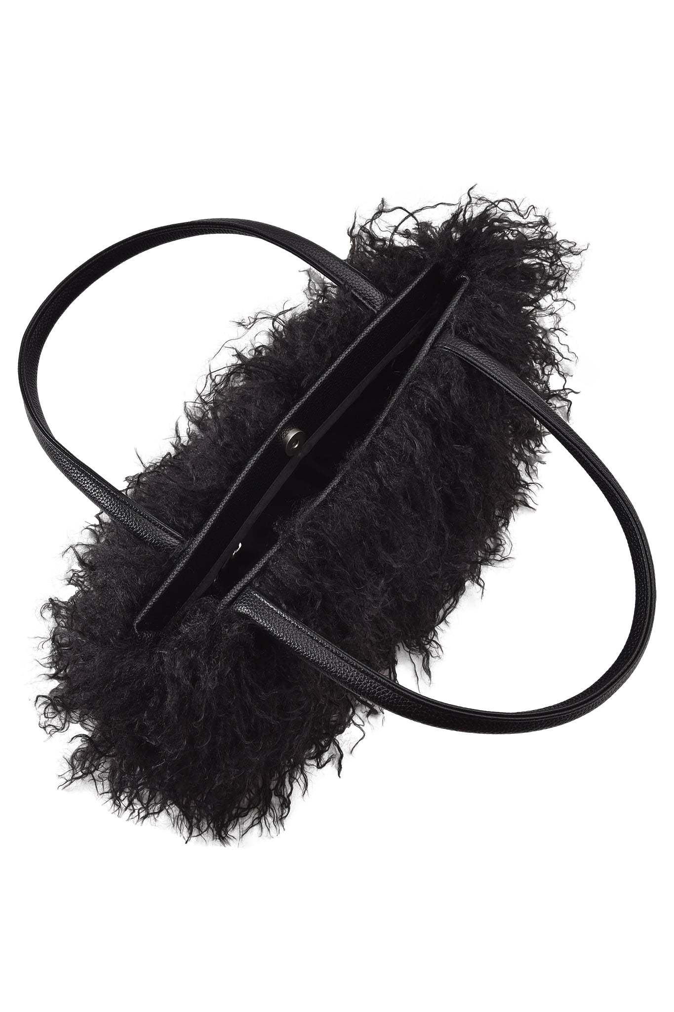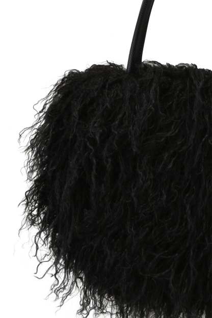- Black faux fur oversized shoulder bag with faux leather handles