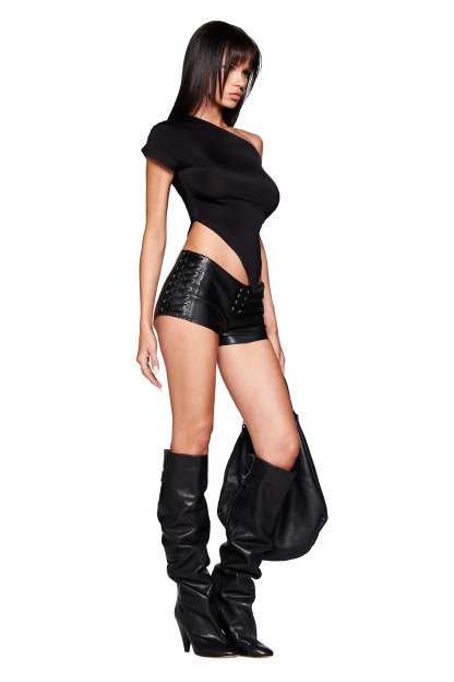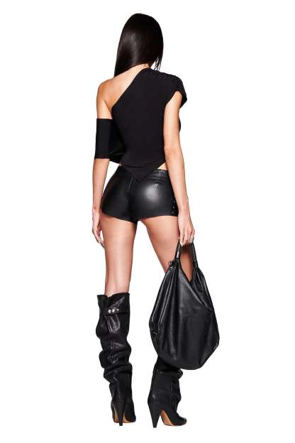 - Fitted hot short with a dolphin silhouette and a micro-mini length