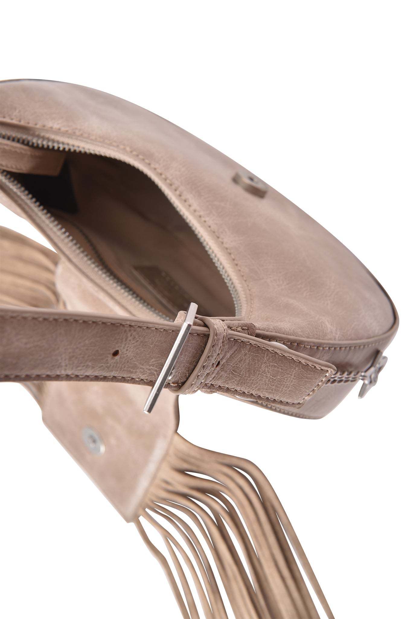 - Fringe detail alongside front flap closure