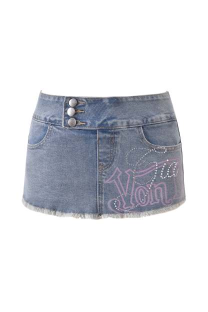 - Denim mini skort in a classic light blue wash designed in collaboration with Von Dutch