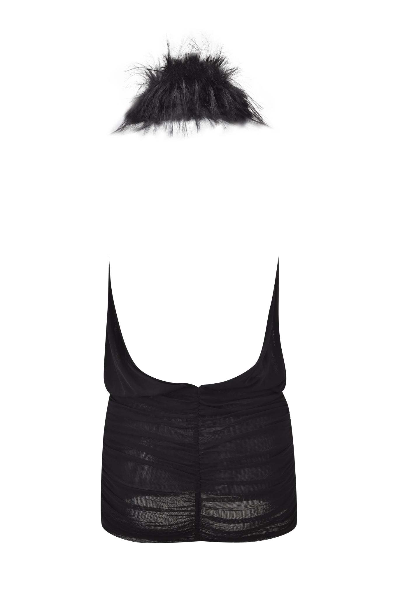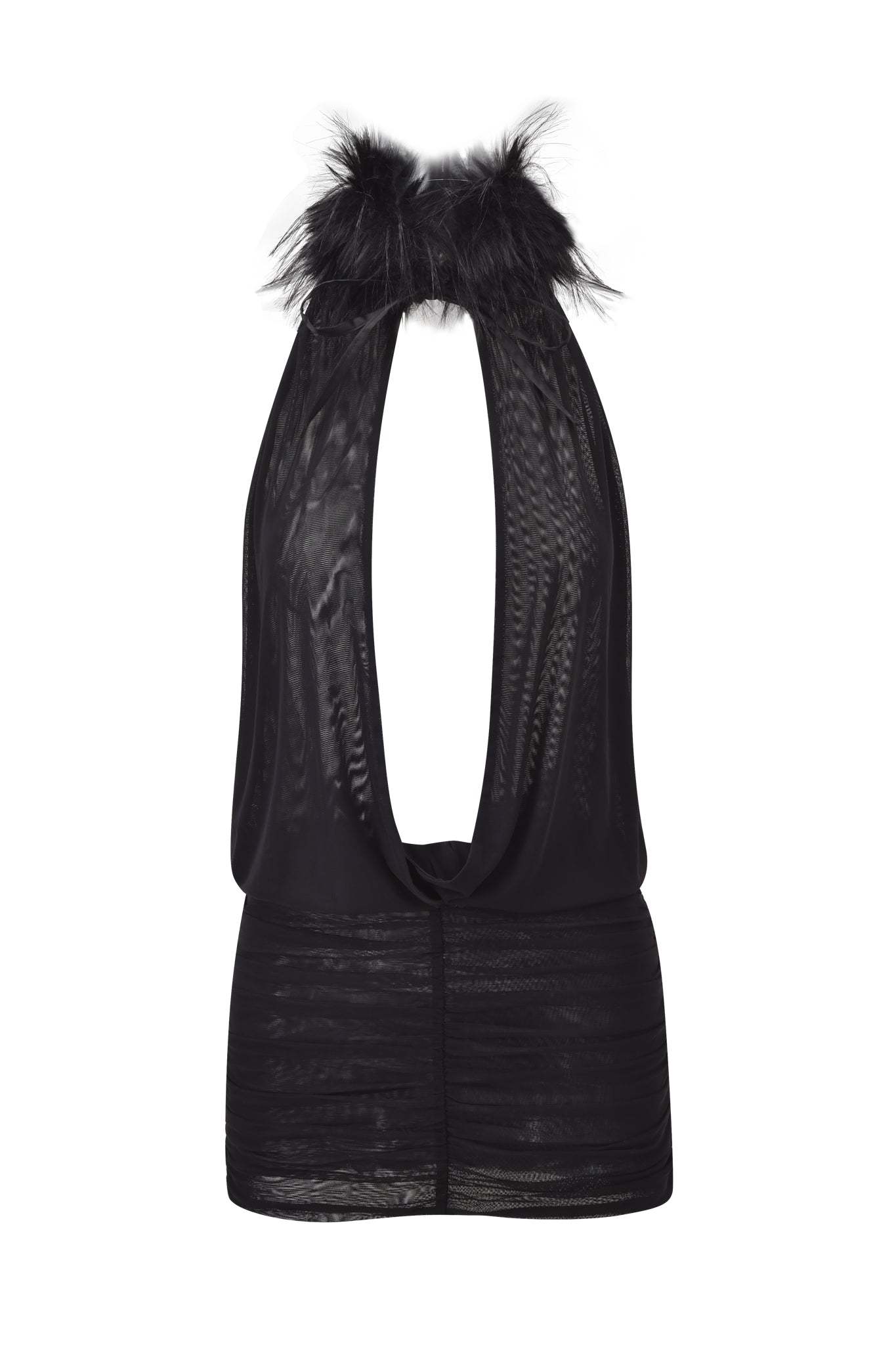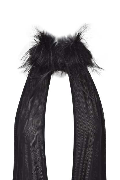 - Neckline is a faux fur and feather collar that ties at centre front neck